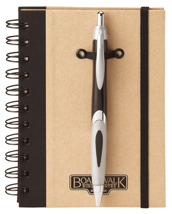 Features: Eco hardbound cardboard journal with pen combo. Ballpoint pen is made out of recycled paper and corn starch. Journal is made out of cardboard with double spiral binding, elastic pen loop on cover and 80 white lined sheets. 70% recycled hard cover and 50% recycled interior.