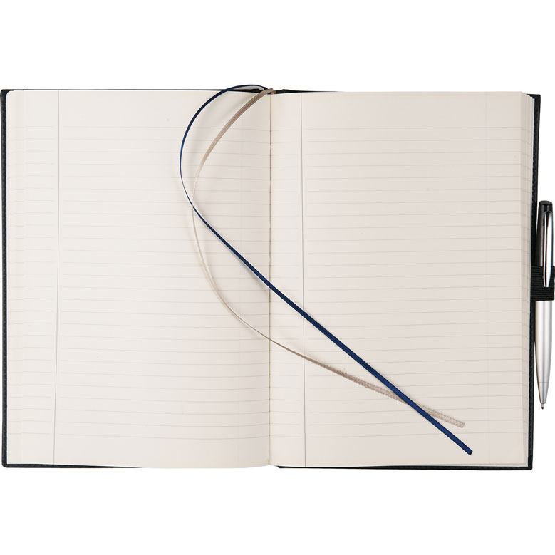 Features : Elastic pen loop, tab-and-loop closure and blue and silver ribbon page markers. Business card slot. Includes a 100-sheet ruled journal book insert.