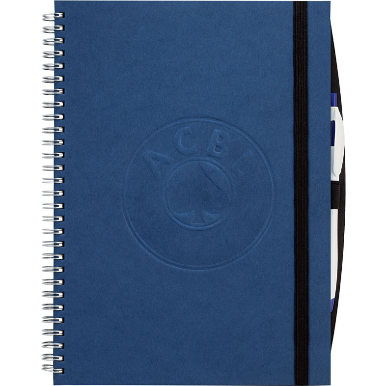 Features : Eco spiral bound journal is made from 72% recycled paper with colored fabric trim, matching elastic closure, bookmark and pen loop, and 80 ivory lined sheets. Recycled paper ball point pen included.