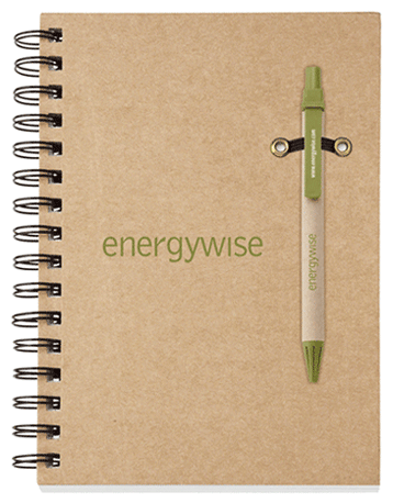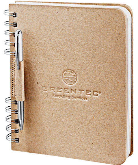 Features: Eco hardbound cardboard journal with pen combo. Ballpoint pen is made out of recycled paper and corn starch. Journal is made out of cardboard with double spiral binding, elastic pen loop on cover and 80 white lined sheets. 70% recycled hard cover and 50% recycled interior.